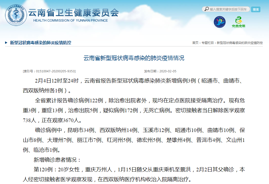 第120例:20岁女性,重庆万州人,1月15日随父从重庆乘机至景洪,2月2日其父确诊,本人经密切接触者医学观察发现,在西双版纳医疗机构收治入院隔离治疗。