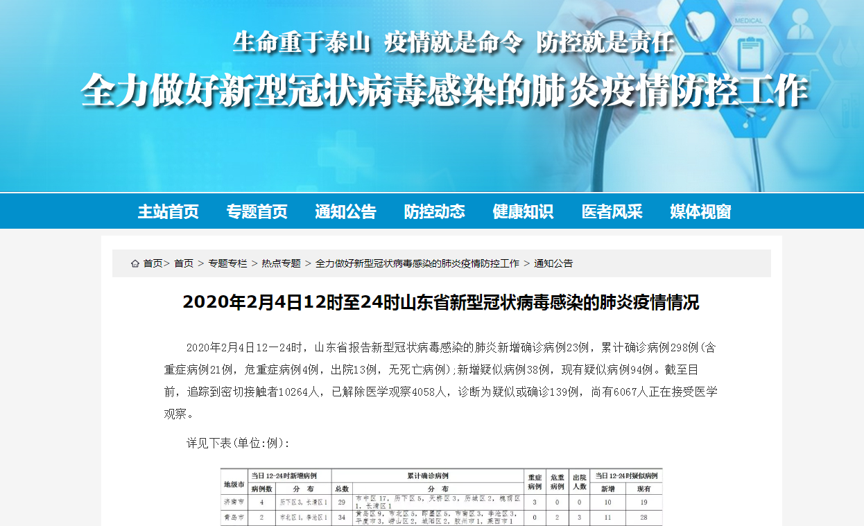 荔枝新闻讯 据山东省卫健委官网消息,2020年2月4日12—24时,山东省报告新型冠状病毒感染的肺炎新增确诊病例23例,累计确诊病例298例(含重症病例21例,危重症病例4例,出院13例,无死亡病例);新增疑似病例38例,现有疑似病例94例。截至目前,追踪到密切接触者10264人,已解除医学观察4058人,诊断为疑似或确诊139例,尚有6067人正在接受医学观察。
