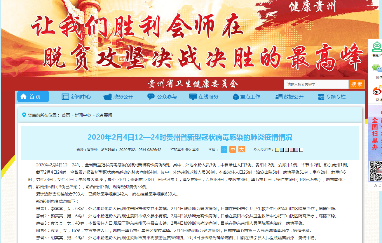 荔枝新闻讯 据贵州省卫健委官网消息,2020年2月4日12—24时,贵州全省新型冠状病毒感染的肺炎新增确诊病例6例。其中,外地来黔人员3例,本省常住人口3例。贵阳市2例、安顺市1例、毕节市2例、黔东南州1例。
