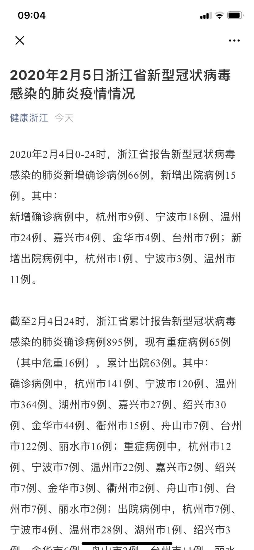 荔枝新闻讯 据健康浙江微信公众号消息,2020年2月4日0-24时,浙江省报告新型冠状病毒感染的肺炎新增确诊病例66例,新增出院病例15例。其中: