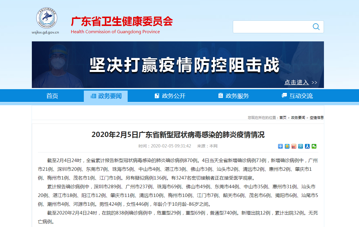荔枝新闻讯 据广东省卫健委官网消息,截至2月4日24时,广东省累计报告新型冠状病毒感染的肺炎确诊病例870例。4日当天全省新增确诊病例73例,新增确诊病例中,广州市21例、深圳市20例、东莞市7例、珠海市5例、中山市4例、湛江市3例、佛山市3例、汕头市2例、清远市2例、惠州市2例、肇庆市1例、梅州市1例、茂名市1例、江门市1例。另有疑似病例136例。有3247名密切接触者正在接受医学观察。