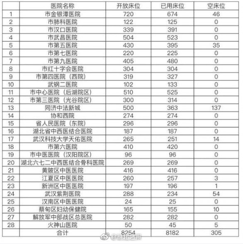 部分医院存在已用床位大于开放床位情况,这是部分医院按“应收尽收”要求,为收治更多疑似患者,竭尽所能、尽最大努力安排加床。因此,表格中的开放床位不完全等于已用床位+空床位。