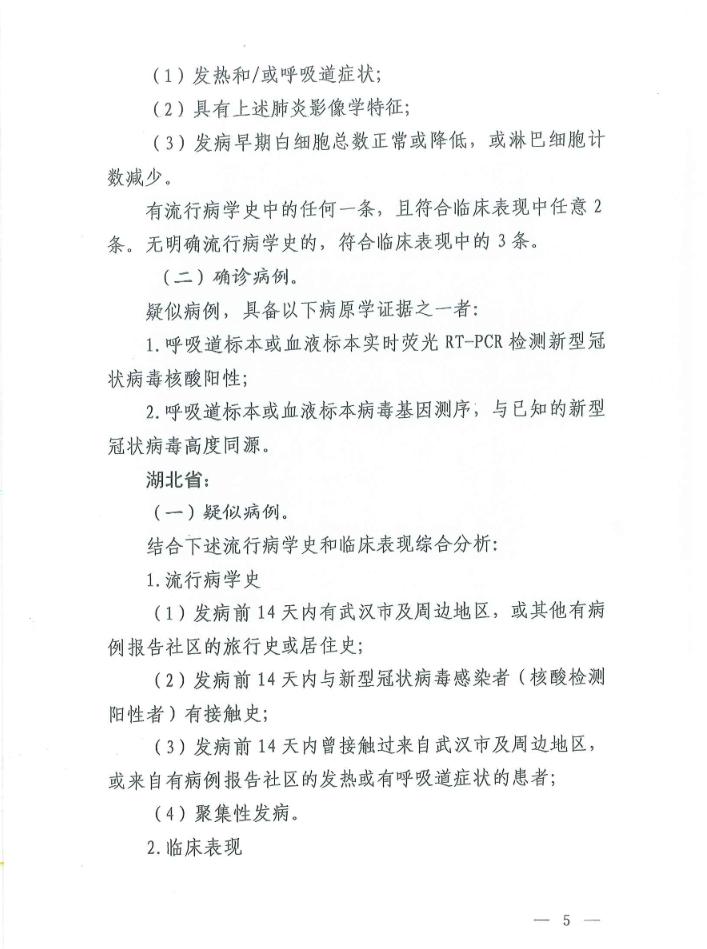为进一步做好新型冠状病毒感染的肺炎病例诊断和医疗救治工作,我们组织专家在对前期医疗救治工作进行分析、研判、总结的基础上,对诊疗方案进行修订,形成了《新型冠状病毒感染的肺炎诊疗方案(试行第五版)》,现印发给你们,请参照执行。各有关医疗机构要在医疗救治工作中积极发挥中医药作用,加强中西医结合,建立中西医联合会诊制度,促进医疗救治取得良好效果。