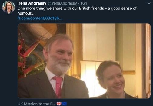 一位官员告诉《金融时报》,英国驻欧盟大使蒂姆 巴罗以幽默的态度接受了这滑稽的失态。