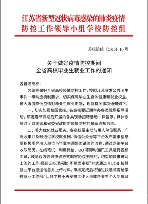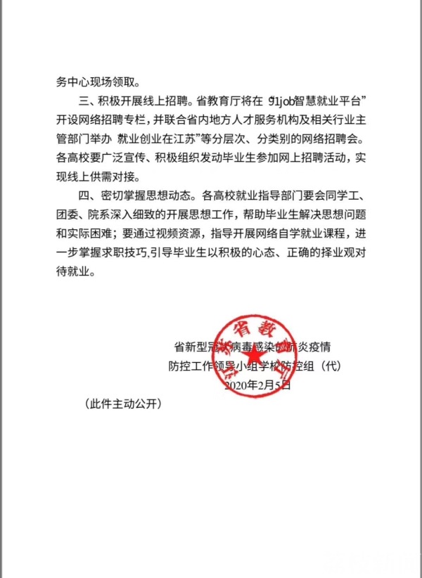 2月5日,记者从江苏省教育厅获悉,江苏省新型冠状病毒感染的肺炎疫情防控工作领导小组学校防控组,针对疫情防控期间全省高校毕业生就业工作发出通知,要求暂停各类现场招聘活动,推动在线就业服务,开展线上招聘。