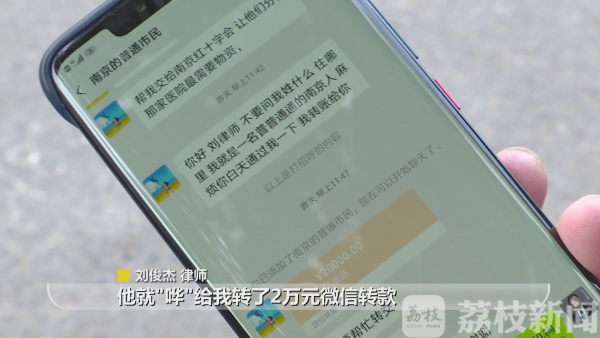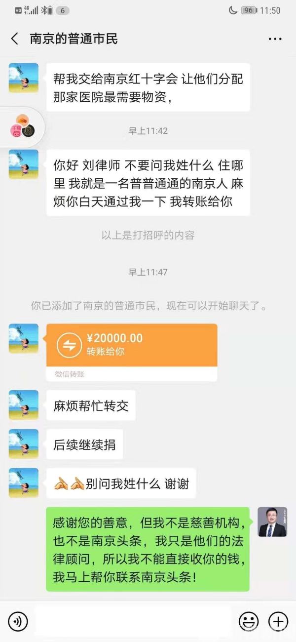 刘俊杰是一名南京律师,2月4日凌晨4点,他突然接到一位署名"南京的普通市民"的加好友申请,随后,一笔2万元的转账到了他的手机上。对方表示,别问我姓什么,我就是一名南京的普通市民,帮我捐给最需要物资的医院。面对这笔2万元善款,刘律师既感动又为难。