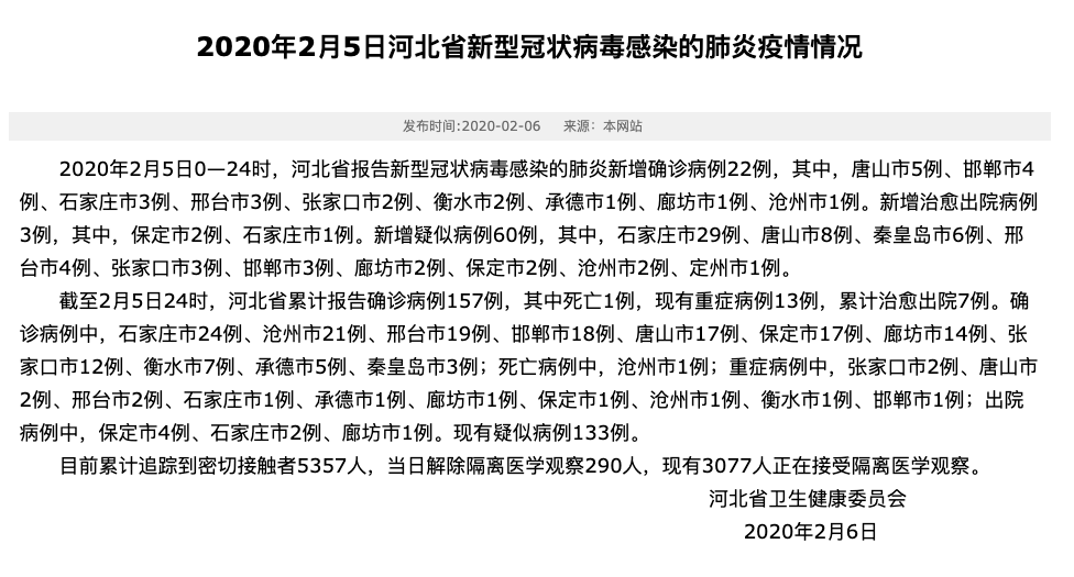 荔枝新闻讯 据河北省卫健委消息,2020年2月5日0—24时,河北省报告新型冠状病毒感染的肺炎新增确诊病例22例,其中,唐山市5例、邯郸市4例、石家庄市3例、邢台市3例、张家口市2例、衡水市2例、承德市1例、廊坊市1例、沧州市1例。新增治愈出院病例3例,其中,保定市2例、石家庄市1例。新增疑似病例60例,其中,石家庄市29例、唐山市8例、秦皇岛市6例、邢台市4例、张家口市3例、邯郸市3例、廊坊市2例、保定市2例、沧州市2例、定州市1例。