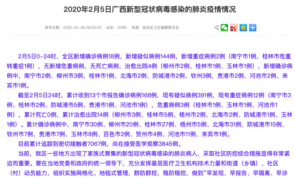 截至2月5日24时,累计收到13个市报告确诊病例168例,现有疑似病例391例,现有重症病例12例(南宁市3例、桂林市2例、防城港市5例、贵港市1例、河池市1例),危重病例3例(桂林市1例、玉林市1例、河池市1例),累计死亡0例,累计治愈出院14例(柳州市3例、桂林市5例、梧州市2例、北海市2例、防城港市1例、玉林1例)。累计确诊病例中,南宁市30例、柳州市20例、桂林市27例、梧州市5例、北海市31例、防城港市15例、钦州市7例、贵港市7例、玉林市8例、百色市2例、贺州市4例、河池市11例、来宾市1例。