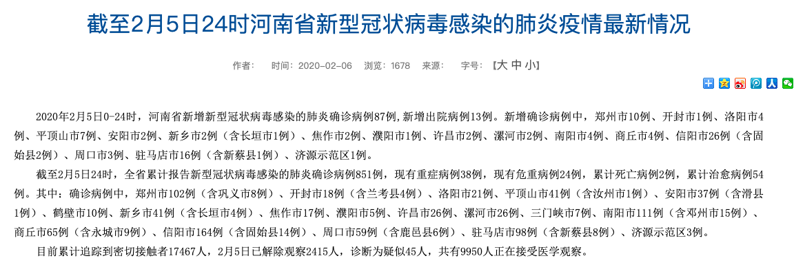 截至2月5日24时,河南省累计报告新型冠状病毒感染的肺炎确诊病例851例,现有重症病例38例,现有危重病例24例,累计死亡病例2例,累计治愈病例54例。其中:确诊病例中,郑州市102例(含巩义市8例)、开封市18例(含兰考县4例)、洛阳市21例、平顶山市41例(含汝州市1例)、安阳市37例(含滑县1例)、鹤壁市10例、新乡市41例(含长垣市4例)、焦作市17例、濮阳市5例、许昌市26例、漯河市26例、三门峡市7例、南阳市111例(含邓州市15例)、商丘市65例(含永城市9例)、信阳市164例(含固始县14例)、周口市59例(含鹿邑县6例)、驻马店市98例(含新蔡县8例)、济源示范区3例。