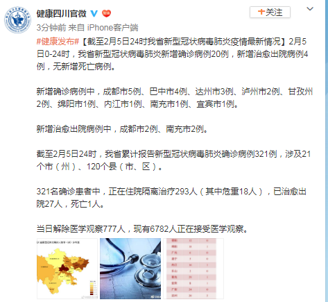 荔枝新闻讯 据健康四川消息,2月5日0-24时,我省新型冠状病毒肺炎新增确诊病例20例,新增治愈出院病例4例,无新增死亡病例。