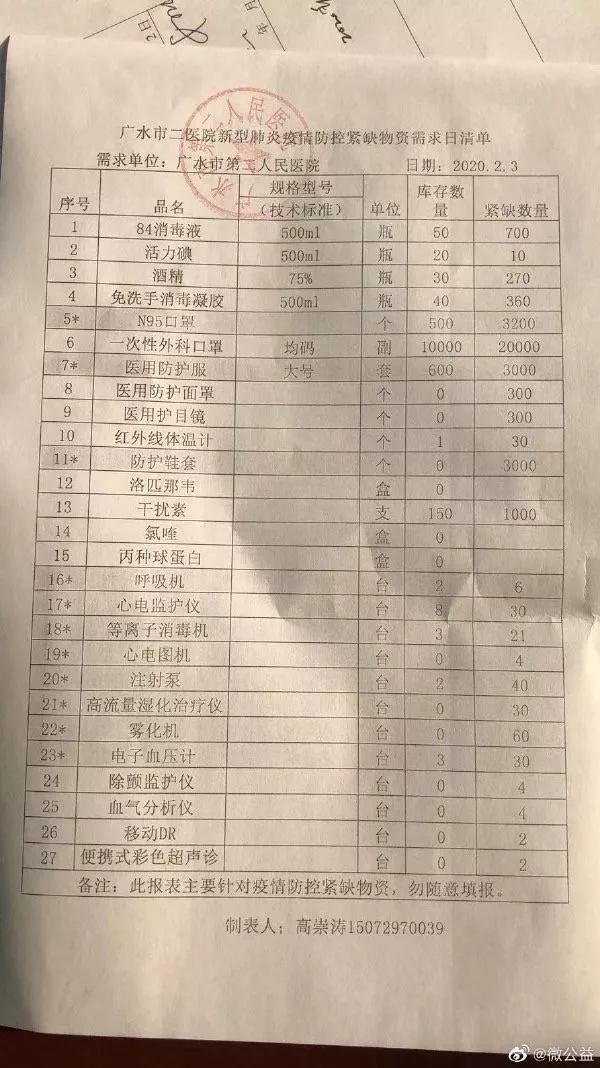 2月5日,记者看到的一份湖北省广水市二医院紧缺物资需求清单显示,该院医用防护面罩、医用护目镜、防护鞋套等许多物品的库存数量都是“0”。广水市是随州市下辖的县级市之一。