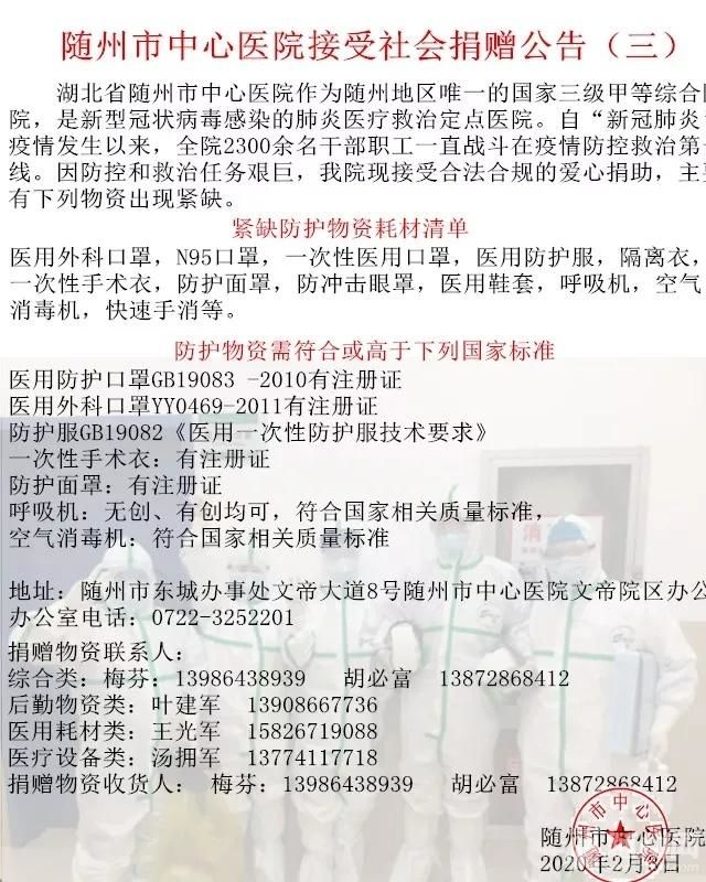 2月3日,随州市唯一的三甲医院——随州市中心医院发布接受社会捐赠的公告,列出的紧缺防护物资耗材清单有“医用外科口罩、N95口罩、一次性医用口罩、医用防护服、隔离衣、一次性手术衣、防护面罩、防冲击眼罩、医用鞋套等”。