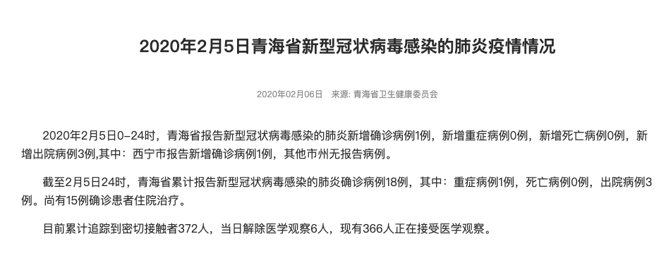 截至2月5日24时,青海省累计报告新型冠状病毒感染的肺炎确诊病例18例,其中:重症病例1例,死亡病例0例,出院病例3例。尚有15例确诊患者住院治疗。 目前累计追踪到密切接触者372人,当日解除医学观察6人,现有366人正在接受医学观察