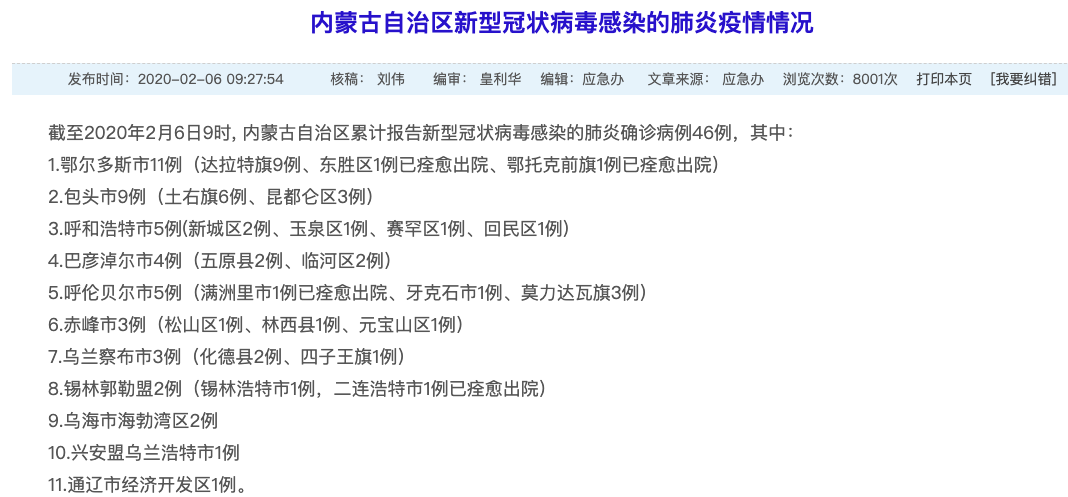 荔枝新闻讯 据内蒙古卫健委消息,截至2020年2月6日9时, 内蒙古自治区累计报告新型冠状病毒感染的肺炎确诊病例46例,其中: