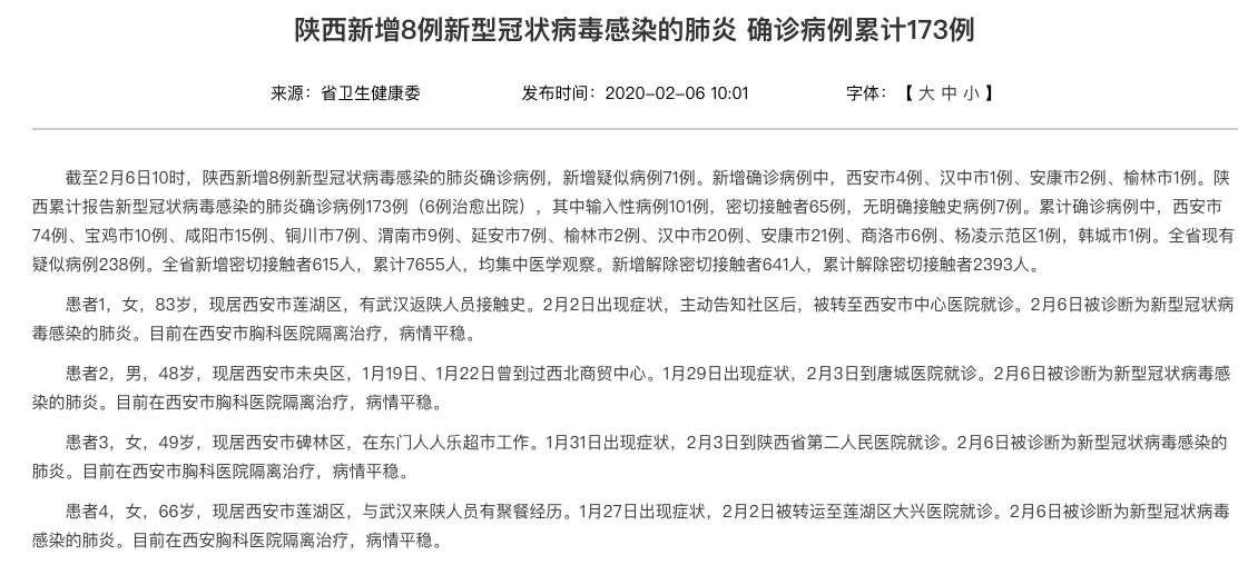患者4,女,66岁,现居西安市莲湖区,与武汉来陕人员有聚餐经历。1月27日出现症状,2月2日被转运至莲湖区大兴医院就诊。2月6日被诊断为新型冠状病毒感染的肺炎。目前在西安胸科医院隔离治疗,病情平稳。
