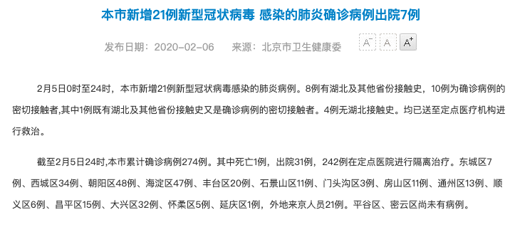 截至2月5日24时,北京市累计确诊病例274例。其中死亡1例,出院31例,242例在定点医院进行隔离治疗。东城区7例、西城区34例、朝阳区48例、海淀区47例、丰台区20例、石景山区11例、门头沟区3例、房山区11例、通州区13例、顺义区6例、昌平区15例、大兴区32例、怀柔区5例、延庆区1例,外地来京人员21例。平谷区、密云区尚未有病例。