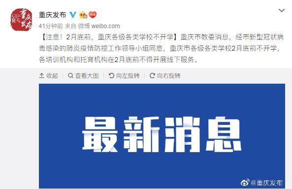 荔枝新闻讯 据重庆市人民政府新闻办公室官方微博,重庆市教委消息,经市新型冠状病毒感染的肺炎疫情防控工作领导小组同意,重庆市各级各类学校2月底前不开学,各培训机构和托育机构在2月底前不得开展线下服务。
