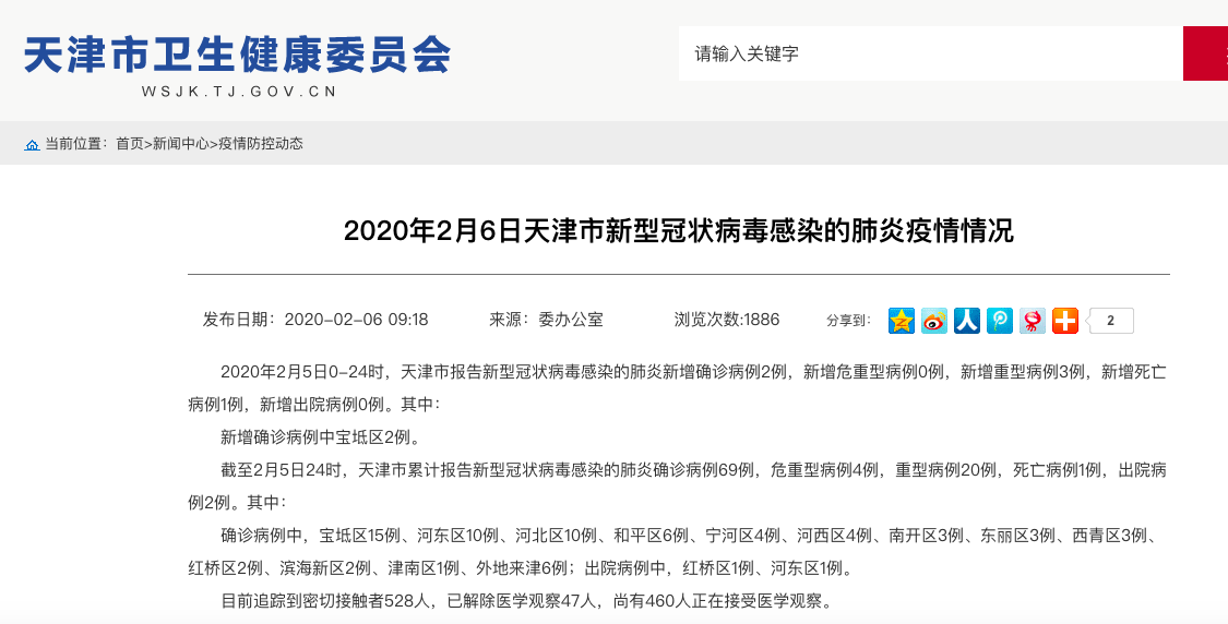第73例患者,女,60岁,居住于天津市宝坻区,1月20日到宝坻区百货大楼服装区购物。该患者1月22日到宝坻区口东农产品交易市场购物,1月23日自觉感冒、伴有头痛,随后出现发热,至2月3日症状无好转,2月4日到宝坻区人民医院发热门诊就诊。2月6日经市专家组确诊为天津市第73例病例,已转至海河医院治疗。目前已对判定的9名密切接触者进行隔离医学观察,其他密切接触者正在排查中,已对其住所进行终末消毒。