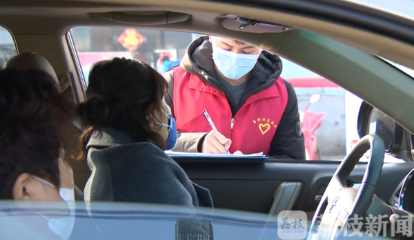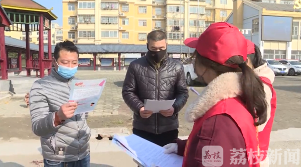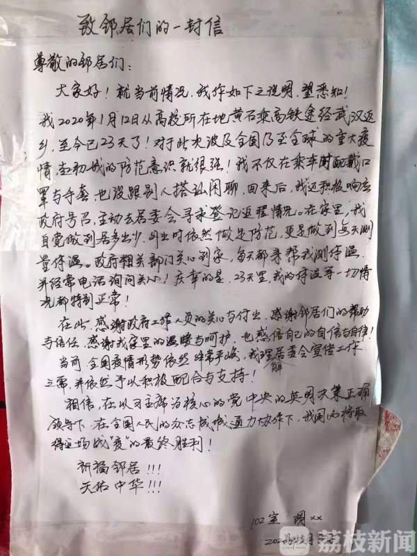 在宿迁市洋河新区酒都名苑小区的一栋楼门口,贴着《致邻居们的一封信》,信的内容是一个从湖北返乡的大学生介绍自己返乡后主动配合社区体检、隔离的情况以及自身身体状况。信的作者胡翔宇,她告诉记者,1月12号,她从黄石乘高铁途经汉口火车站回到了江苏, 在胡翔宇居家隔离的日子里,医护人员每天两次上门测量体温,社区工作人员还送来了消毒用品。