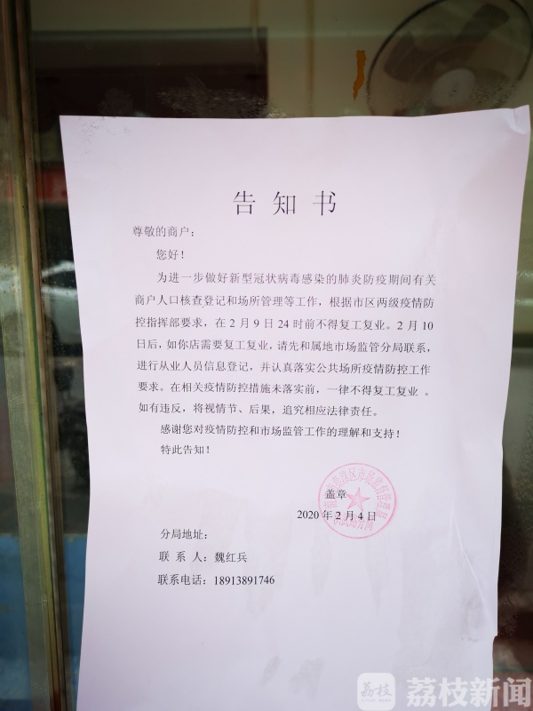 2月6日中午,南京秦淮区市场监管局洪武路分局执法人员对辖区内的所有沿街门面进行突击检查,在每家沿街门面张贴告知书:要求已经关门的商铺在2月9日24时前不得复工复业。2月10日后,如果需要复工复业,要先和属地市场监管分局联系,进行从业人员信息登记,并认真落实公共场所疫情防控工作要求。在检查过程中,执法人员发现一家水果店并未落实疫情防疫工作,对进入人员并未进行体温检测。“对顾客的体温要有检测,体温超过37.3的不能进来了,你要赶紧整改,下午我们来复查,如果不到位立即停业。”检查人员说。