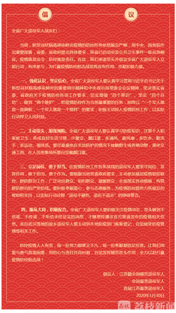 今年年初,武汉爆发新型冠状病毒感染的肺炎疫情,一天天增长的确诊人数和防疫前线的“战况”,牵动着全国人民的心。江苏省退役军人事务厅多次专题传达上级有关精神,第一时间部署相关工作,并动员江苏省优秀退役军人典型,向全省退役军人发出倡议:立即行动,有序参与,为打赢疫情防控阻击战发挥应有作用,贡献积极力量。