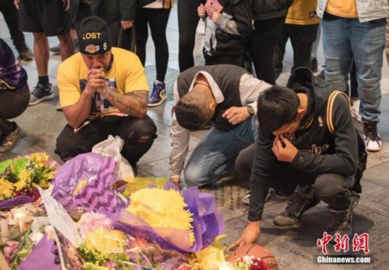 当地时间1月27日,球迷在NBA洛杉矶湖人队主场斯台普斯中心旁边的广场上悼念科比·布莱恩特。26日,科比·布莱恩特的私人直升机在加州小城卡拉巴萨斯坠毁,包括科比及其二女儿在内的机上9人全部遇难。中新社记者 刘关关 摄
