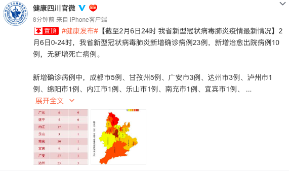 荔枝新闻讯 据四川省卫健委官方微博消息,2月6日0-24时,四川省新型冠状病毒肺炎新增确诊病例23例,新增治愈出院病例10例,无新增死亡病例。