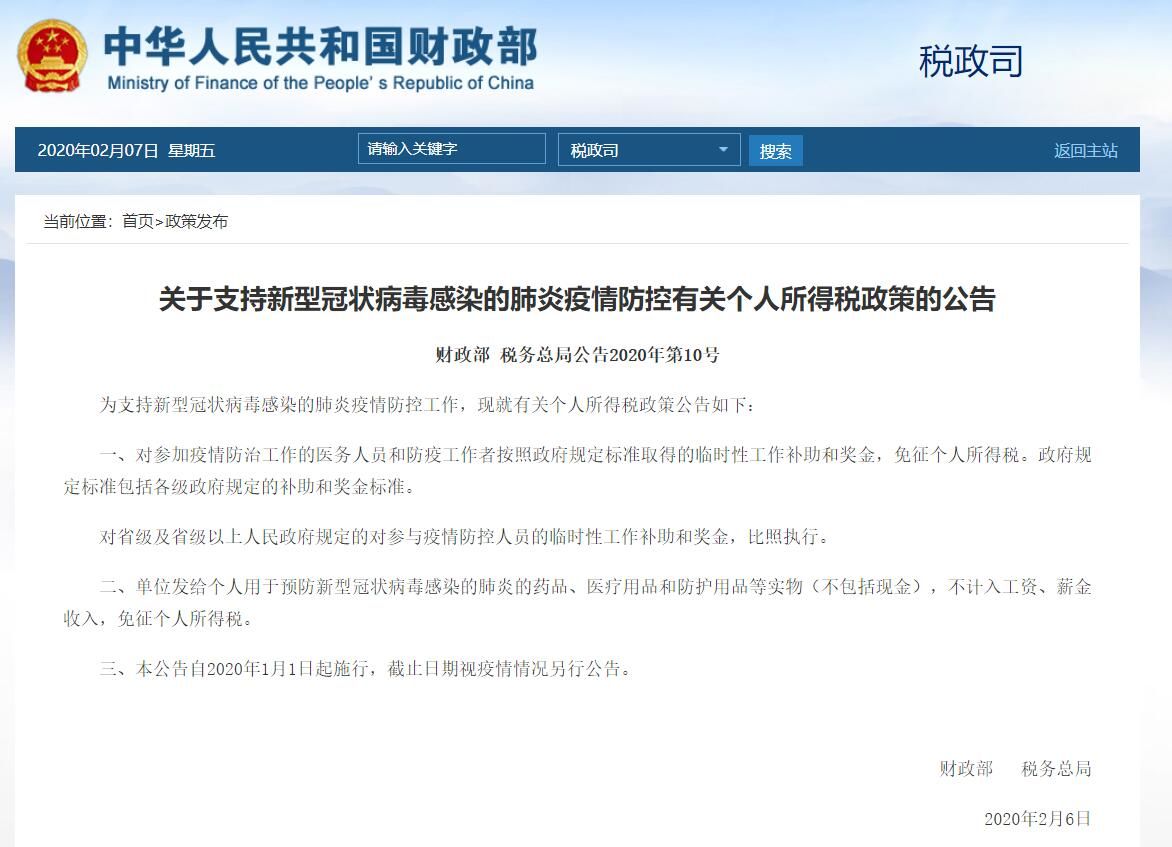 2月7日,财政部官网发布了《关于支持新型冠状病毒感染的肺炎疫情防控有关个人所得税政策的公告》,全文如下: