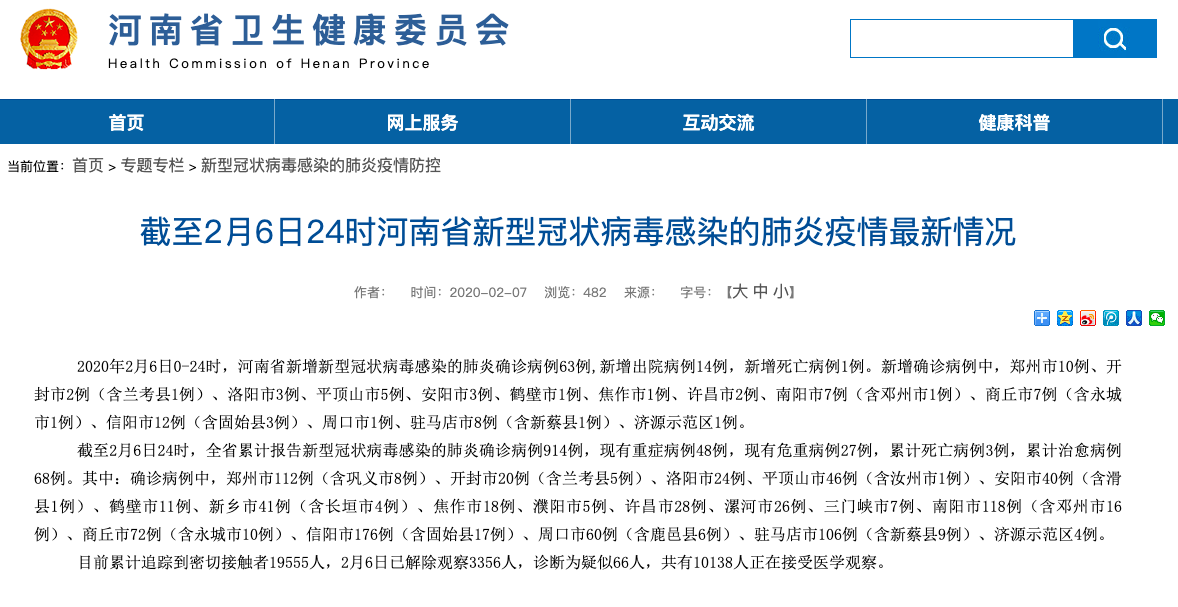 截至2月6日24时,全省累计报告新型冠状病毒感染的肺炎确诊病例914例,现有重症病例48例,现有危重病例27例,累计死亡病例3例,累计治愈病例68例。其中:确诊病例中,郑州市112例(含巩义市8例)、开封市20例(含兰考县5例)、洛阳市24例、平顶山市46例(含汝州市1例)、安阳市40例(含滑县1例)、鹤壁市11例、新乡市41例(含长垣市4例)、焦作市18例、濮阳市5例、许昌市28例、漯河市26例、三门峡市7例、南阳市118例(含邓州市16例)、商丘市72例(含永城市10例)、信阳市176例(含固始县17例)、周口市60例(含鹿邑县6例)、驻马店市106例(含新蔡县9例)、济源示范区4例。