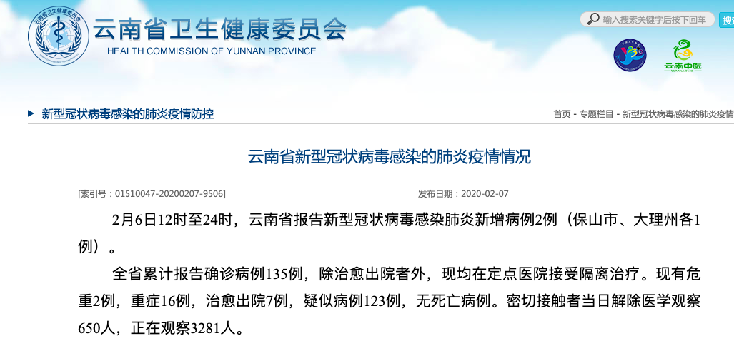 云南卫健委官网截图