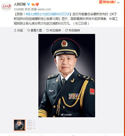 武汉市慈善总会最新发布的《关于新冠肺炎防控捐赠款物公告第12期》显示,国家最高科学技术奖获得者、中国工程院院士钱七虎分两次向武汉捐款650万元。(长江日报)