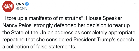 佩洛西在发布会上表示,撕毁演讲稿副本是为了引起美国人民的注意,为了让美国人民意识到,这一切都不是真的。她指出,“我们不希望众议院成为特朗普的真人秀背景,他的演讲还反映了一种与现实毫无关系的精神状态”。