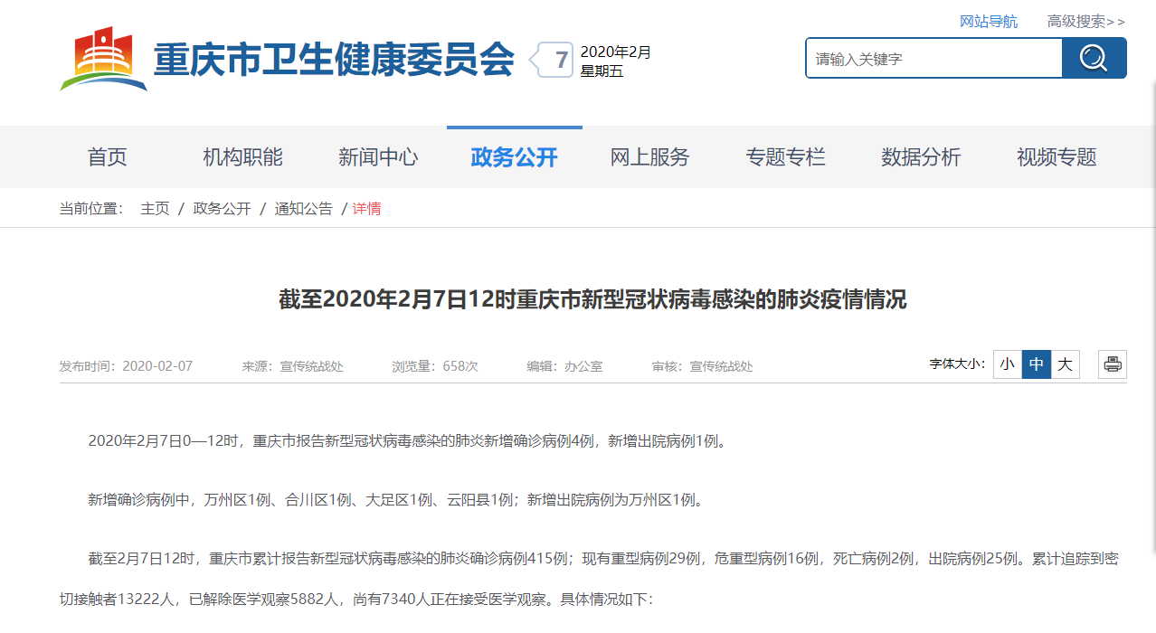 截至2月7日12时,重庆市累计报告新型冠状病毒感染的肺炎确诊病例415例;现有重型病例29例,危重型病例16例,死亡病例2例,出院病例25例。累计追踪到密切接触者13222人,已解除医学观察5882人,尚有7340人正在接受医学观察。(总台央视记者 唐巍 牟亮)