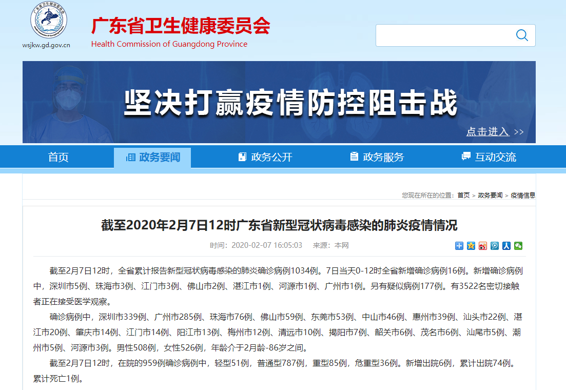 荔枝新闻讯 截至今天(2月7日)12时,广东省累计报告新型冠状病毒感染的肺炎确诊病例1034例,2月7日0到12时全省新增确诊病例16例,深圳市5例、珠海市3例、江门市3例,佛山市2例,广州市、湛江市、河源市各1例。另有疑似病例177例,有3522名密切接触者正在接受医学观察。累计出院74例,累计死亡病例1例。(总台央视记者 张莉莉)