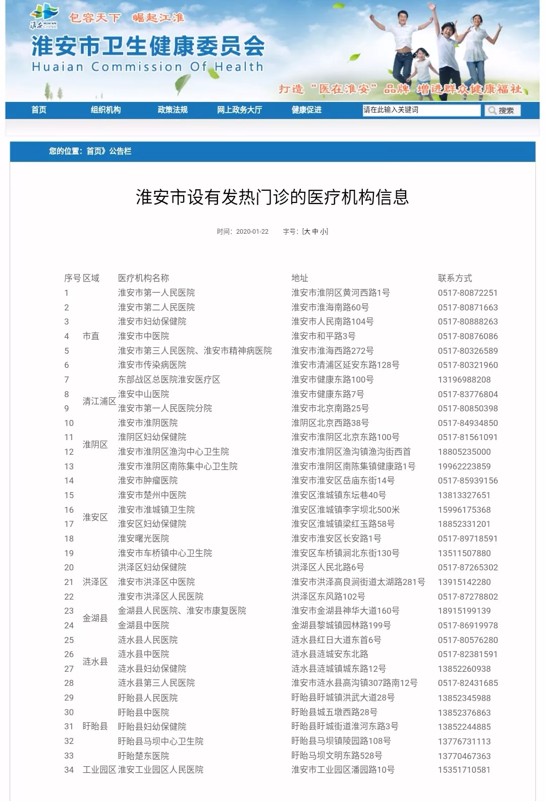 淮安市设有发热门诊的医疗机构信息 ↓↓↓