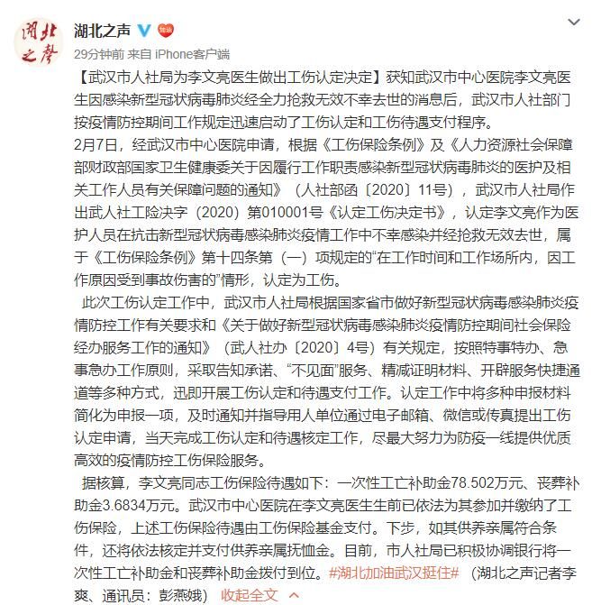 【武汉市人社局为李文亮医生做出工伤认定决定】获知武汉市中心医院李文亮医生因感染新型冠状病毒肺炎经全力抢救无效不幸去世的消息后,武汉市人社部门按疫情防控期间工作规定迅速启动了工伤认定和工伤待遇支付程序。