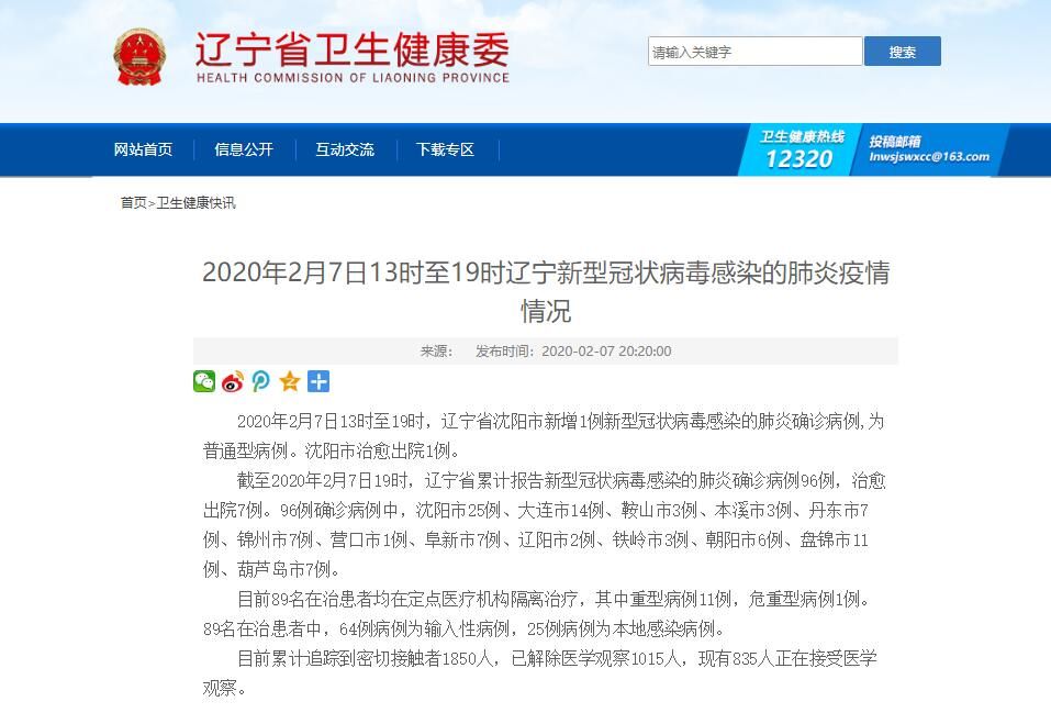 截至2020年2月7日19时,辽宁省累计报告新型冠状病毒感染的肺炎确诊病例96例,治愈出院7例。96例确诊病例中,沈阳市25例、大连市14例、鞍山市3例、本溪市3例、丹东市7例、锦州市7例、营口市1例、阜新市7例、辽阳市2例、铁岭市3例、朝阳市6例、盘锦市11例、葫芦岛市7例。