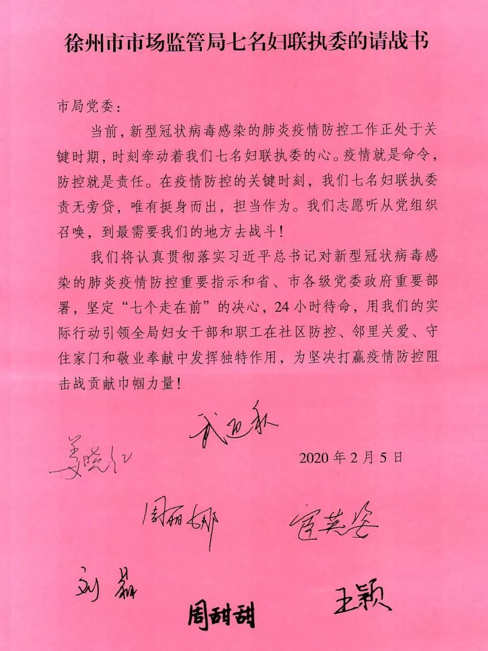 在当前疫情防控的阻击战中,徐州市场监管系统女同胞正不惧风险、逆行而上,战斗在抗击疫情的最前线。徐州市局妇联的七名执委还向市局党委递交了的请战书,志愿听从党组织召唤,到最需要的地方去战斗!