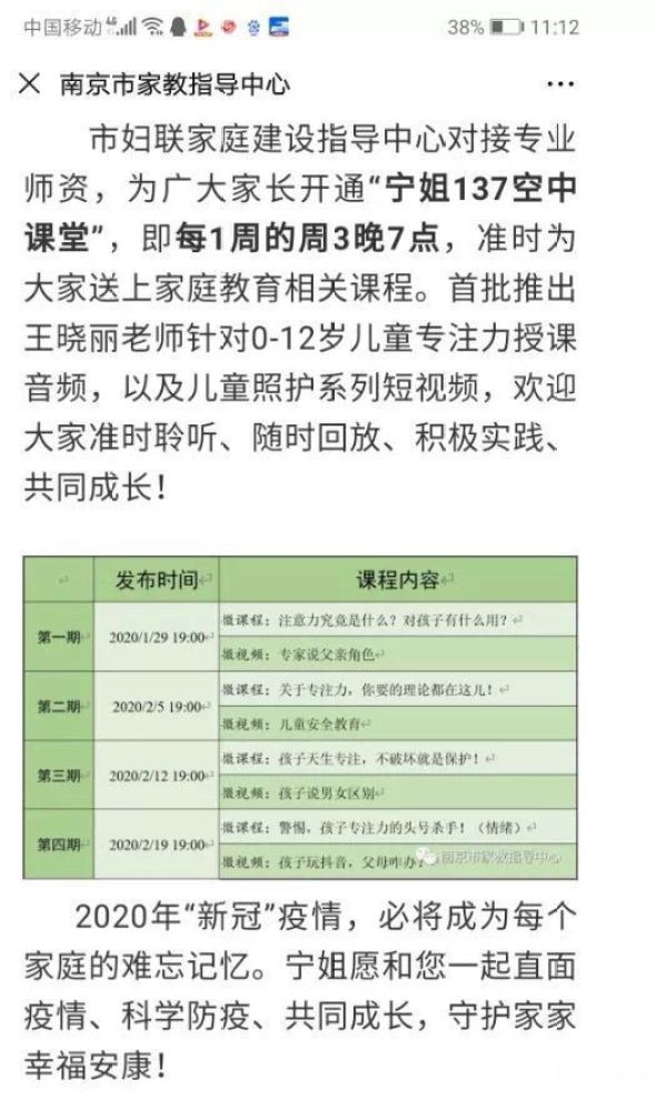 南京市妇联家庭建设指导服务中心对接专业师资,1月28日正式上线了“宁姐137空中课堂”(每周三晚7点开课),让家长宅在家中聆听家庭教育课程,学习做更好的家长。