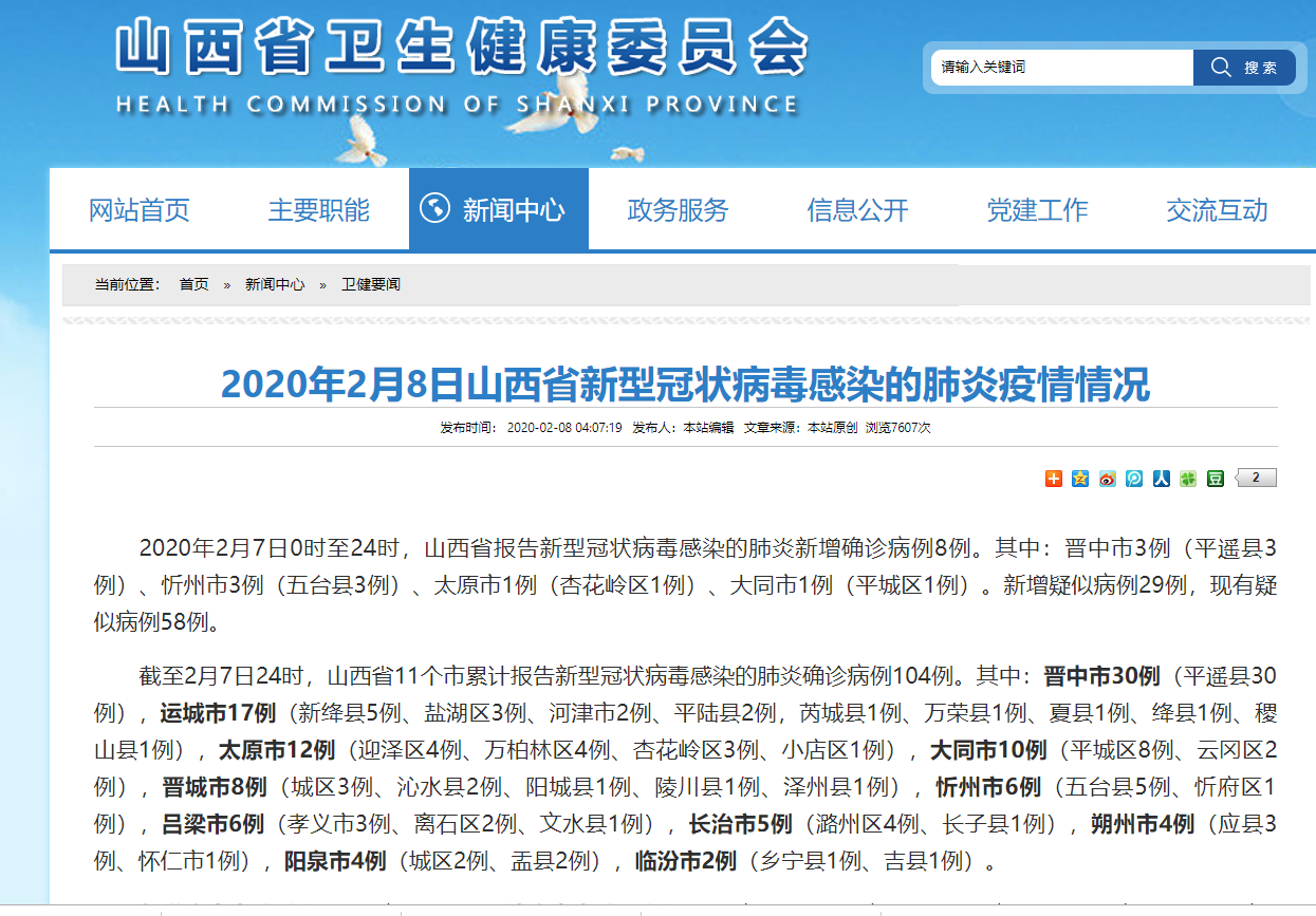 荔枝新闻讯 2020年2月7日0时至24时,山西省报告新型冠状病毒感染的肺炎新增确诊病例8例。其中:晋中市3例(平遥县3例)、忻州市3例(五台县3例)、太原市1例(杏花岭区1例)、大同市1例(平城区1例)。新增疑似病例29例,现有疑似病例58例。
