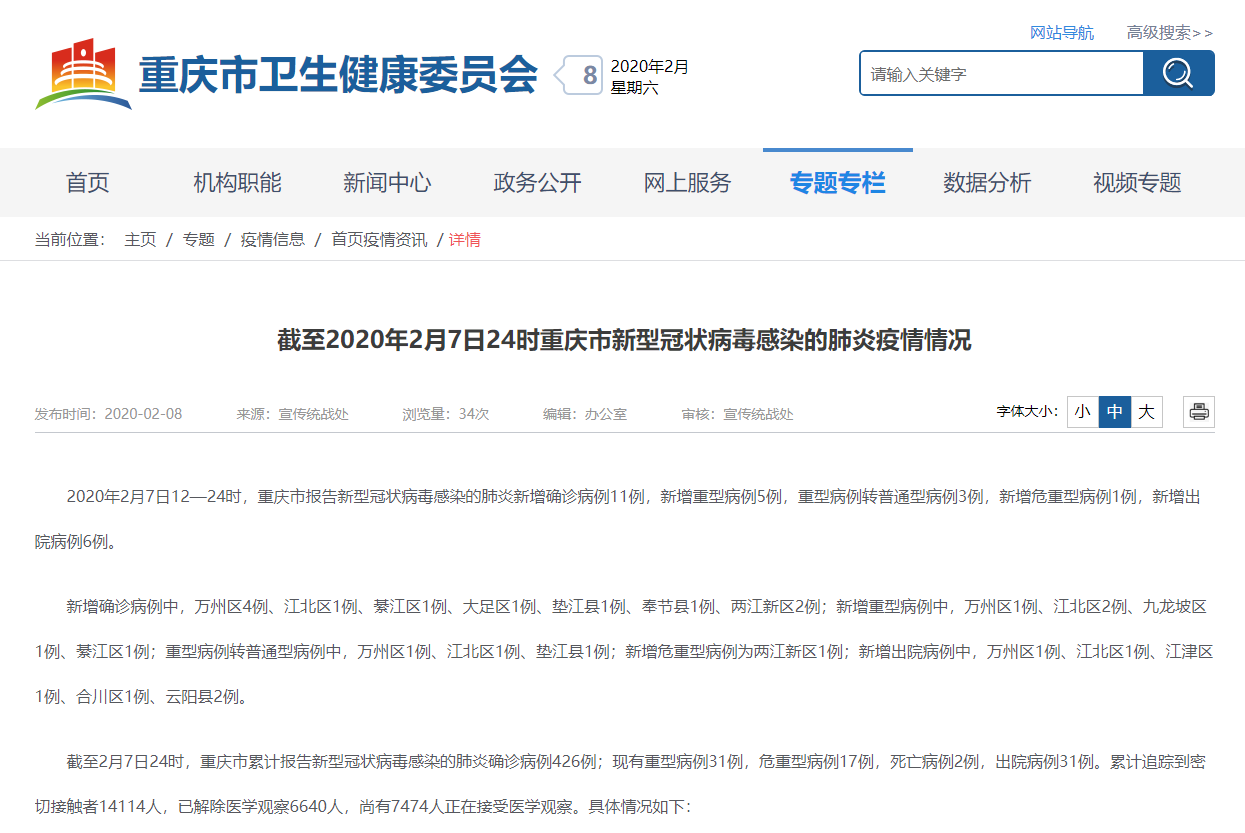 截至2月7日24时,重庆市累计报告新型冠状病毒感染的肺炎确诊病例426例;现有重型病例31例,危重型病例17例,死亡病例2例,出院病例31例。累计追踪到密切接触者14114人,已解除医学观察6640人,尚有7474人正在接受医学观察。