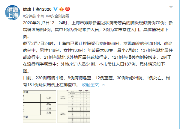 荔枝新闻讯 2020年2月7日12—24时,上海市排除新型冠状病毒感染的肺炎疑似病例70例;新增确诊病例4例,其中1例为外地来沪人员,3例为本市常住人口。