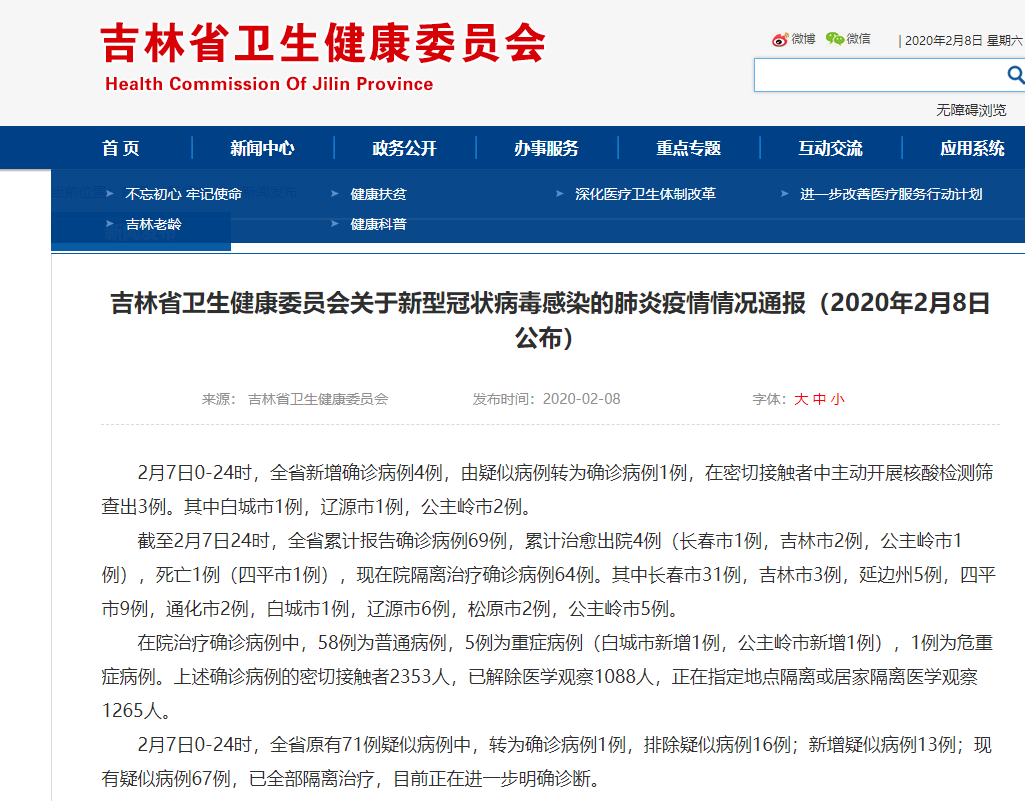 截至2月7日24时,吉林省累计报告确诊病例69例,累计治愈出院4例(长春市1例,吉林市2例,公主岭市1例),死亡1例(四平市1例),现在院隔离治疗确诊病例64例。其中长春市31例,吉林市3例,延边州5例,四平市9例,通化市2例,白城市1例,辽源市6例,松原市2例,公主岭市5例。