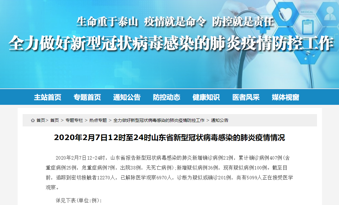 2020年2月7日12-24时,山东省报告新型冠状病毒感染的肺炎新增确诊病例21例,累计确诊病例407例(含重症病例25例,危重症病例7例,出院38例,无死亡病例);新增疑似病例36例,现有疑似病例100例。截至目前,追踪到密切接触者12270人,已解除医学观察6970人,诊断为疑似或确诊201例,尚有5099人正在接受医学观察。