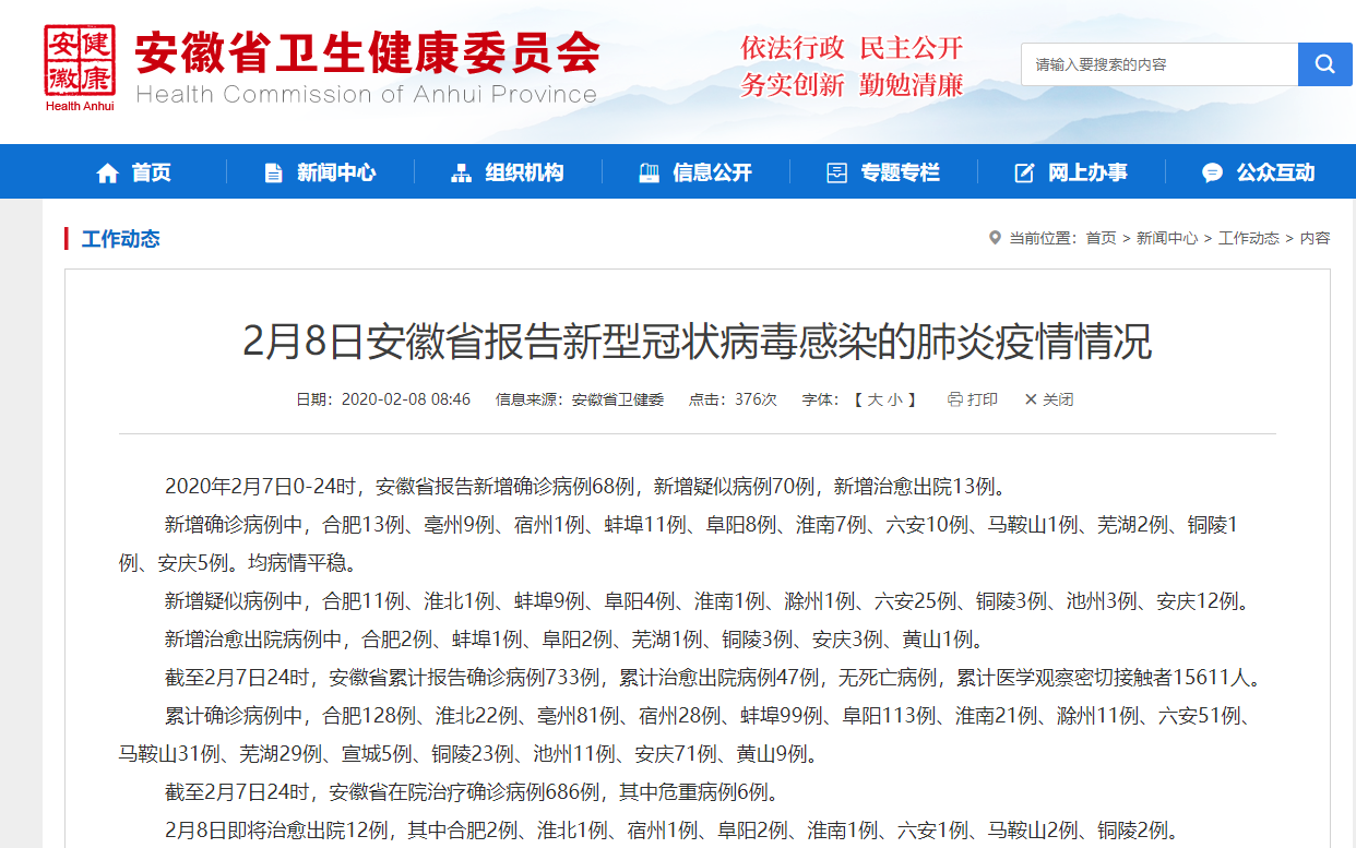 截至2月7日24时,安徽省累计报告确诊病例733例,累计治愈出院病例47例,无死亡病例,累计医学观察密切接触者15611人。