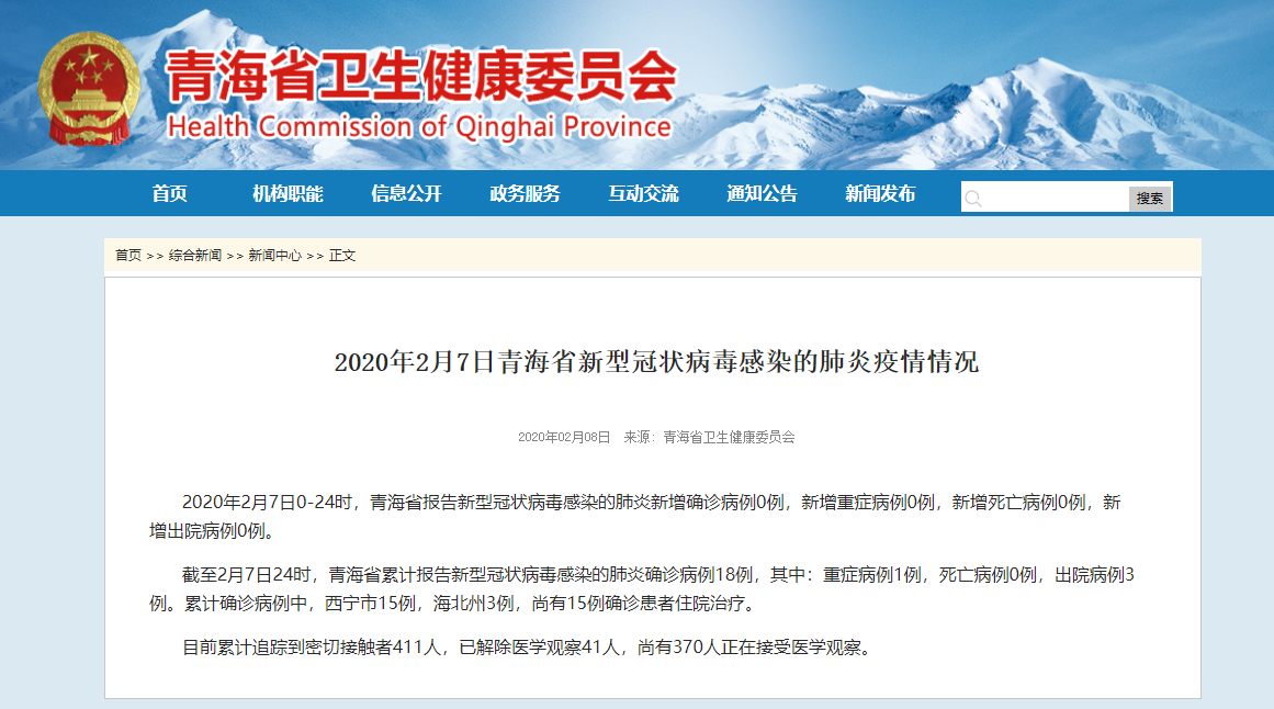 荔枝新闻讯 2020年2月7日0-24时,青海省报告新型冠状病毒感染的肺炎新增确诊病例0例,新增重症病例0例,新增死亡病例0例,新增出院病例0例。
