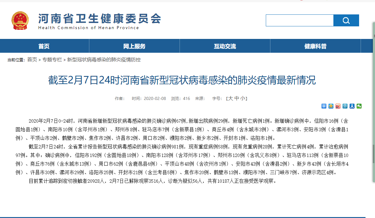 截至2月7日24时,全省累计报告新型冠状病毒感染的肺炎确诊病例981例,现有重症病例58例,现有危重病例28例,累计死亡病例4例,累计治愈病例97例。其中:确诊病例中,信阳市192例(含固始县18例)、南阳市128例(含邓州市17例)、郑州市120例(含巩义市8例)、驻马店市113例(含新蔡县10例)、商丘市76例(含永城市13例)、周口市62例(含鹿邑县6例)、平顶山市48例(含汝州市1例)、安阳市43例(含滑县2例)、新乡市43例(含长垣市4例)、许昌市30例、漯河市29例、洛阳市25例、开封市21例(含兰考县5例)、焦作市20例、鹤壁市13例、濮阳市7例、三门峡市7例、济源示范区4例。
