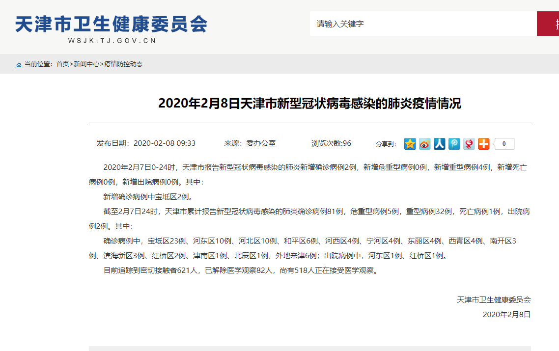 荔枝新闻讯 2020年2月7日0-24时,天津市报告新型冠状病毒感染的肺炎新增确诊病例2例,新增危重型病例0例,新增重型病例4例,新增死亡病例0例,新增出院病例0例。其中: