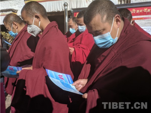 图为拉萨大昭寺僧人认真阅读疫情防控宣传资料 摄影:唐启胜