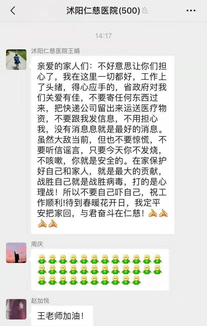 2月7日下午2点17分,在武汉支援的护士长王娟,在宿迁沭阳县仁慈医院群里发了一条消息。这是自2月2日到达武汉后,她第一次在群里给大家报平安。